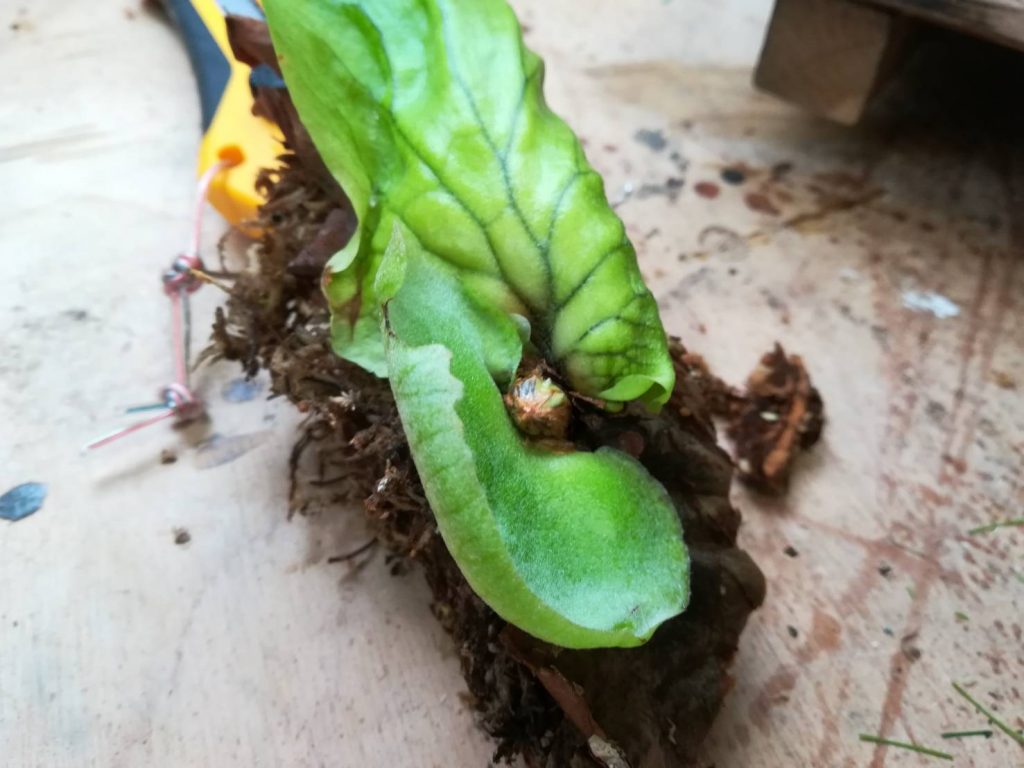貯水葉にカッターを入れ大胆に切除。